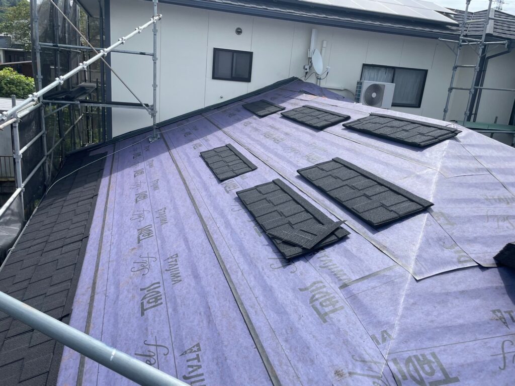 下地調整ができたら、粘着ルーフィングを被せて貼り、屋根内部や室内へ雨水が入るのを防ぎます。最後に新しい屋根材を葺き、棟包みを取り付けて屋根カバー工法完了です。